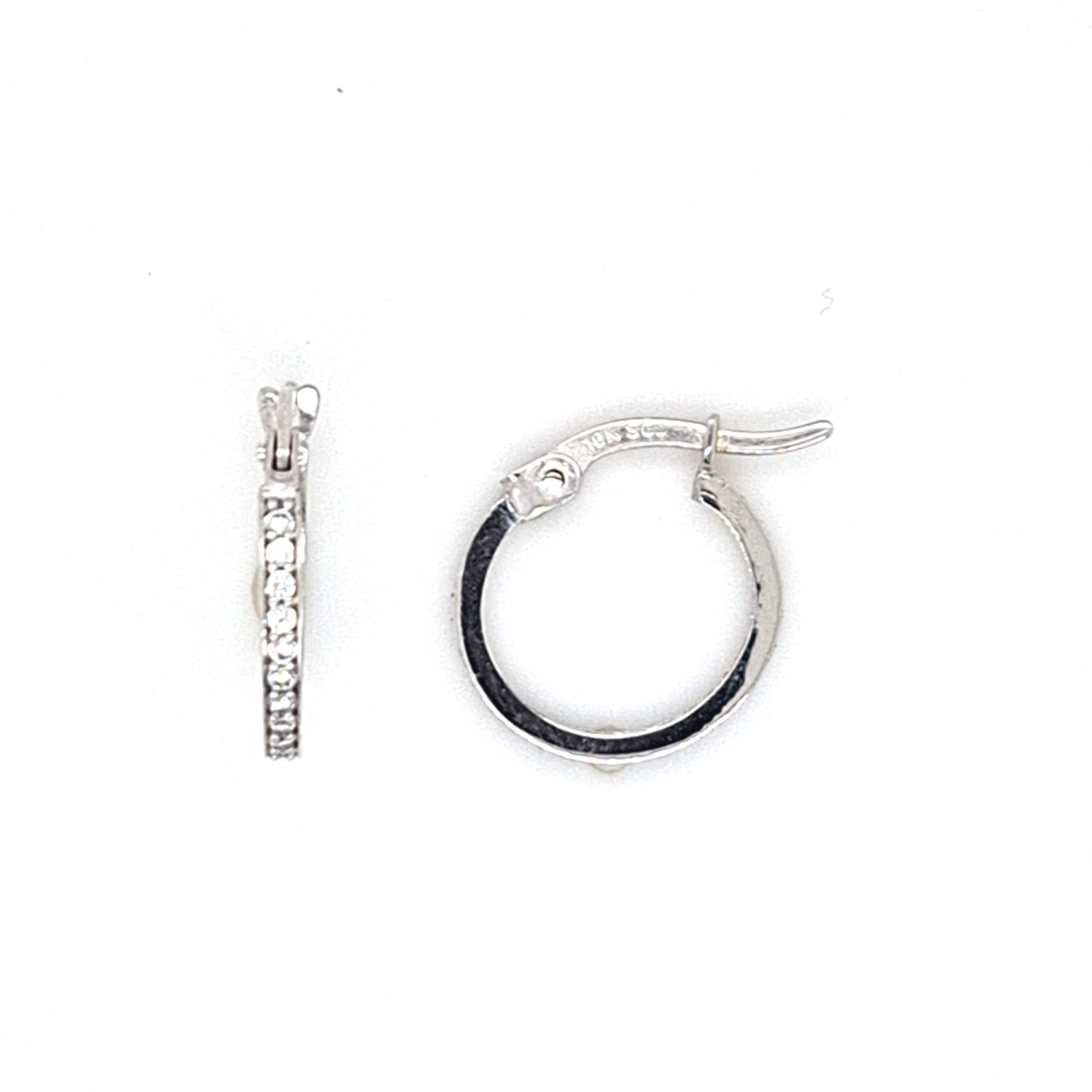 10K white gold 13 x 1.5mm small hoop earrings with cubic zirconias and u-clip closure.