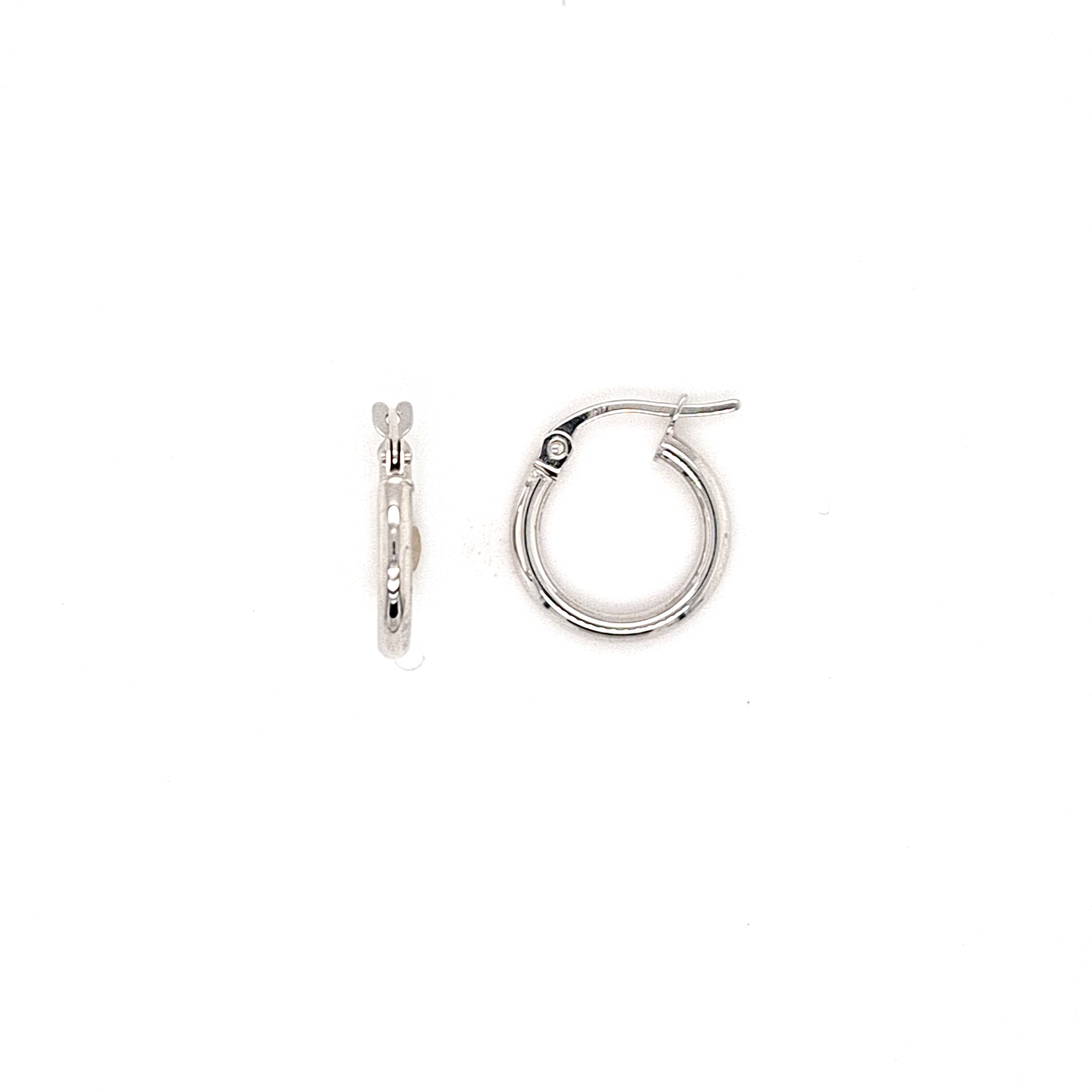10K white gold 14 x 2mm round tube hoop earring with u-clip closure.