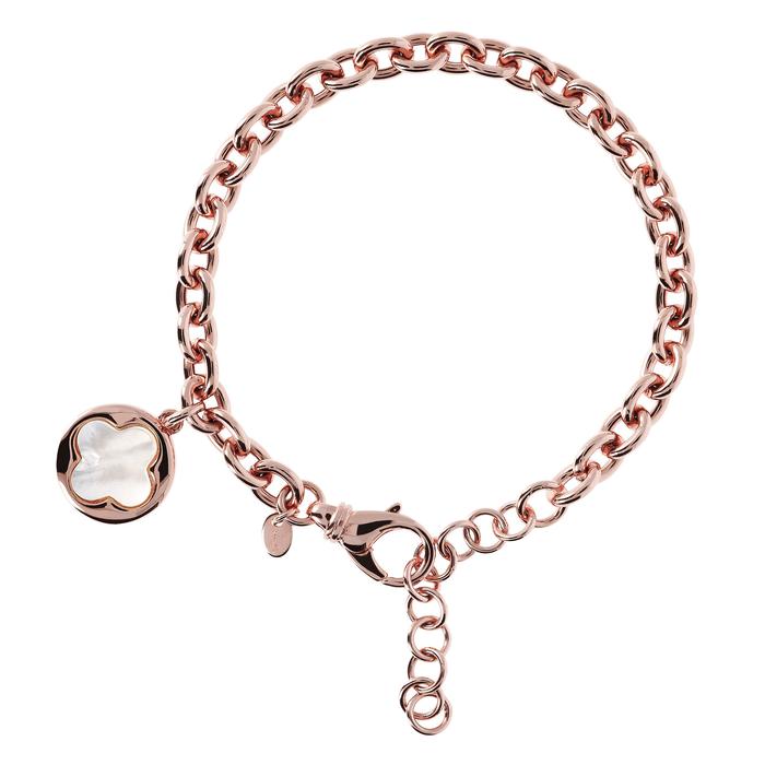 BRONZALLURE 18K rose gold plated over bronze 7.5+1.5”; 8 x 6.5mm oval link bracelet with 15.5mm round charm featuring clover shape cut out and white mother of pearl inlay. Bracelet has a large lobster claw clasp and is from the Alba Collection.