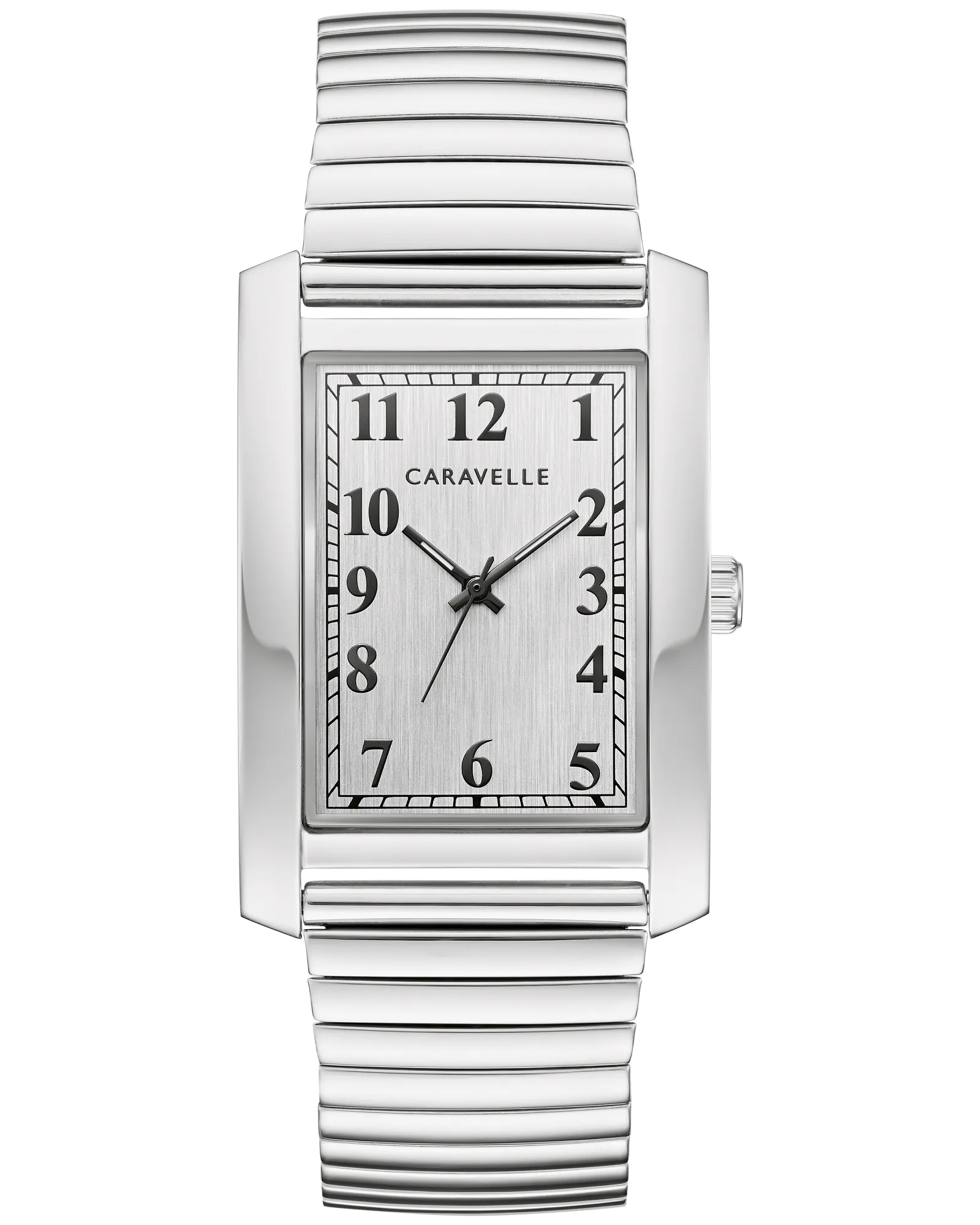 Easily transition from day to night with sophisticated style. Stainless steel tank shaped case with silver-white Arabic style easy-to-read dial and added dimension with a curved mineral crystal. Stainless steel comfort-fit expansion bracelet.
