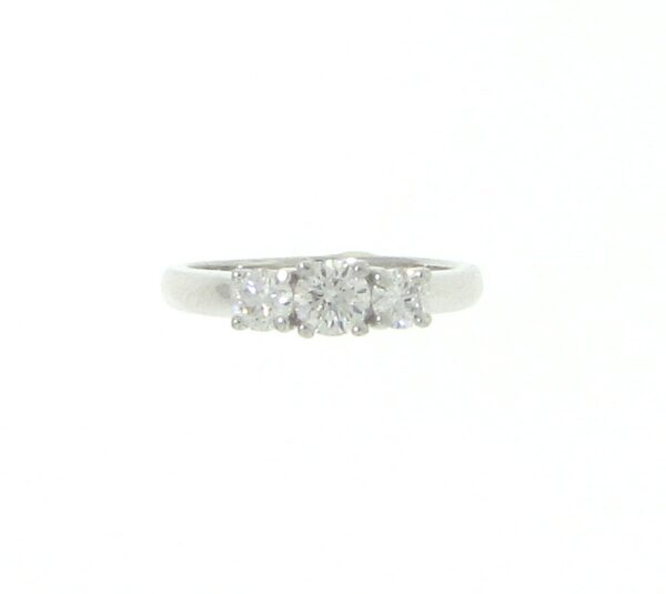 14K white gold three stone diamond ring with claw setting set with center diamond .34ct SI1 HI; 2 side diamonds @ .36ctw SI2 HI size 5 3/4