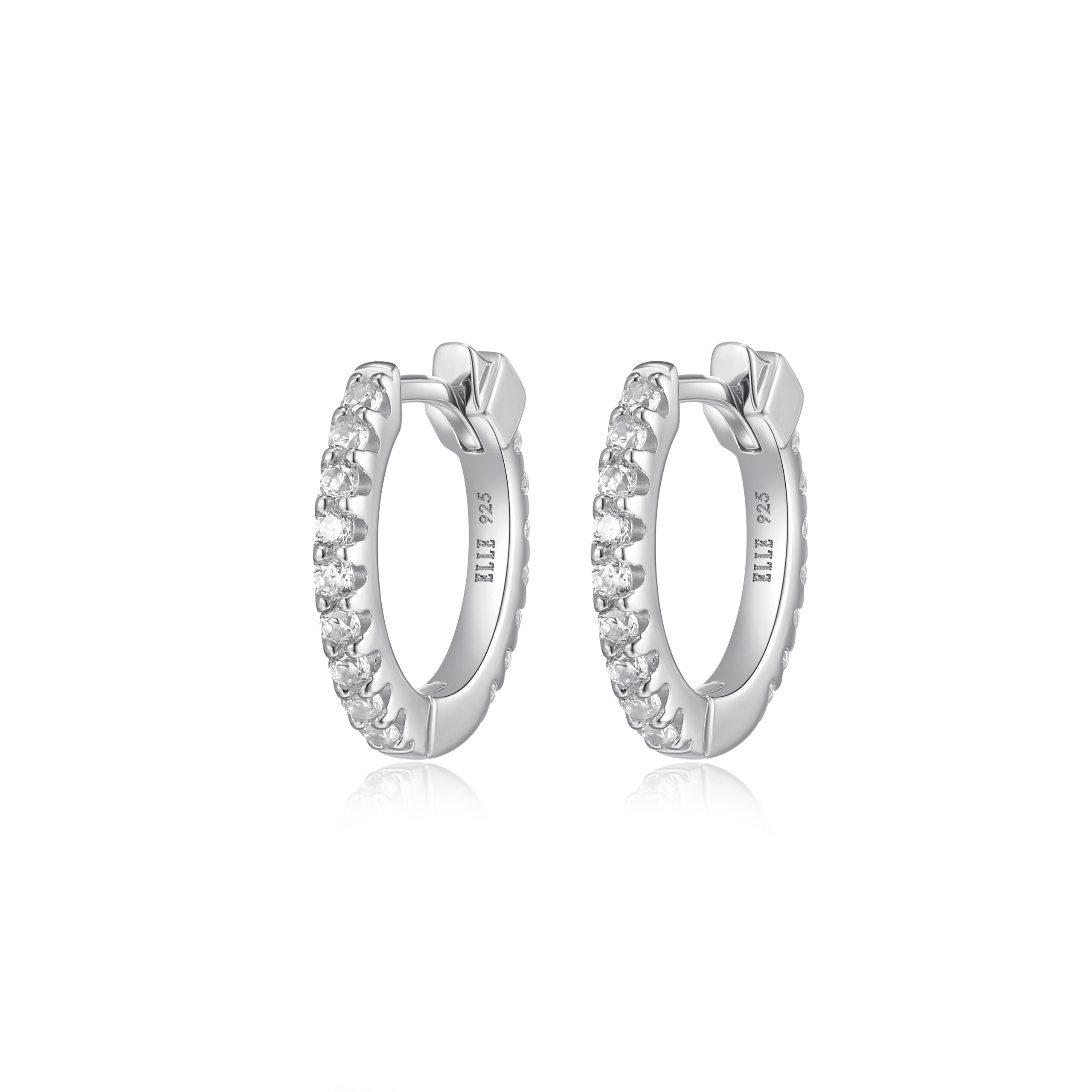 Sterling silver ELLE 15mm hoop with front/back cubic zirconias and huggie style closure. Trademark red stone on back of earring, from the “Stardust” collection