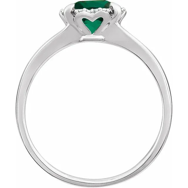 14K white gold, rhodium plated halo ring with a 6x6mm cushion cut, green lab grown emerald and .05cttw of natural round cut diamonds with heart cut out pattern on side view.