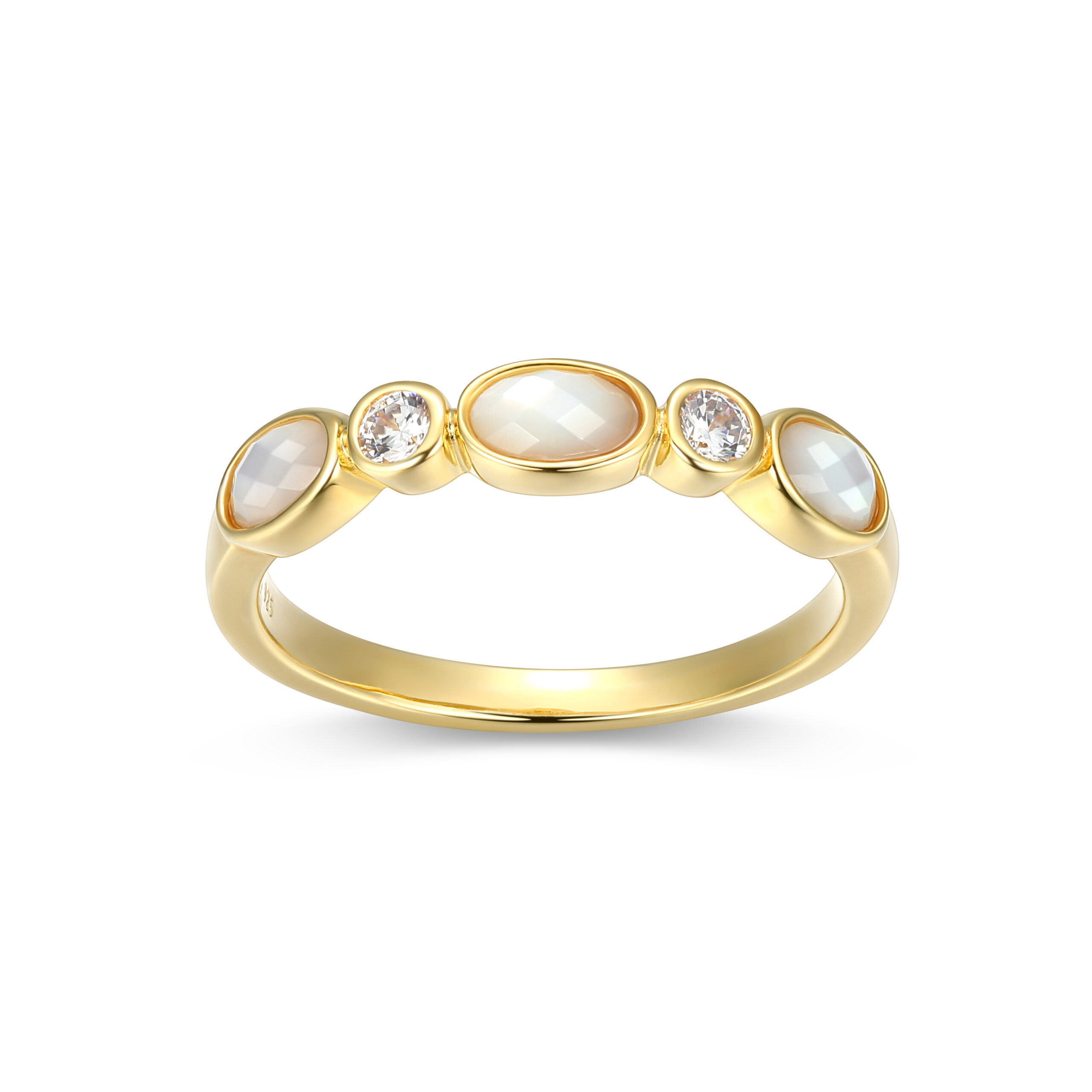 Sterling silver, yellow gold plated REIGN ring with alternating bezel set oval, facetted Mother of pearl and bezel set round white cubic zirconia.