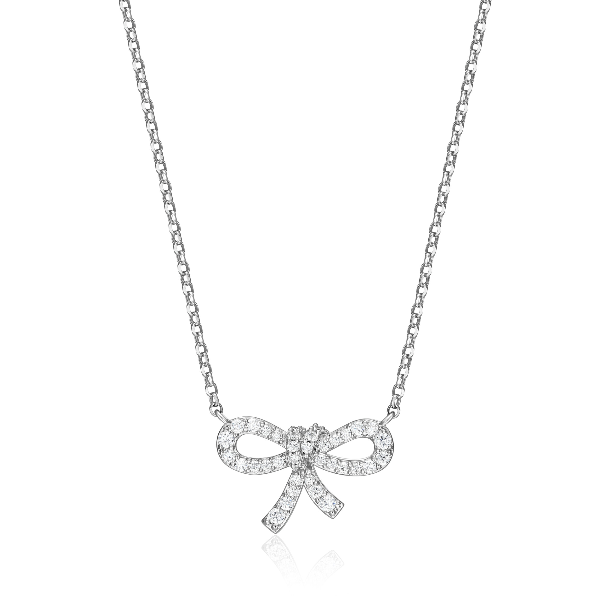 Sterling silver, rhodium plated REIGN 16x10mm bow necklace with claw set cubic zirconias and an 18” adjustable cable link chain with spring ring clasp.