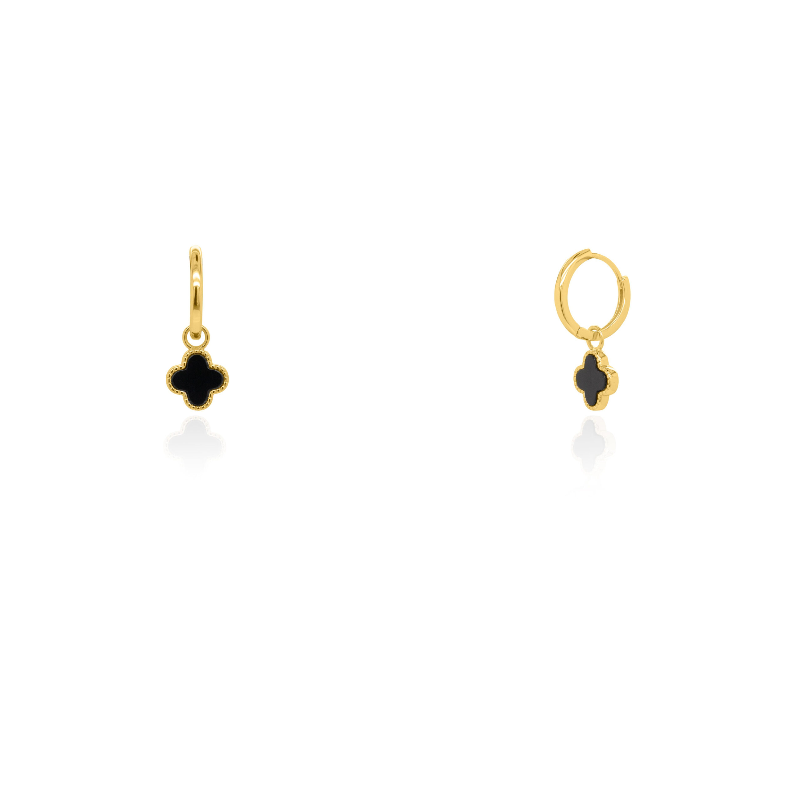 Sterling silver, gold plated 15mm huggie hoop earrings with a 10mm black agate clover charm with beaded edge.