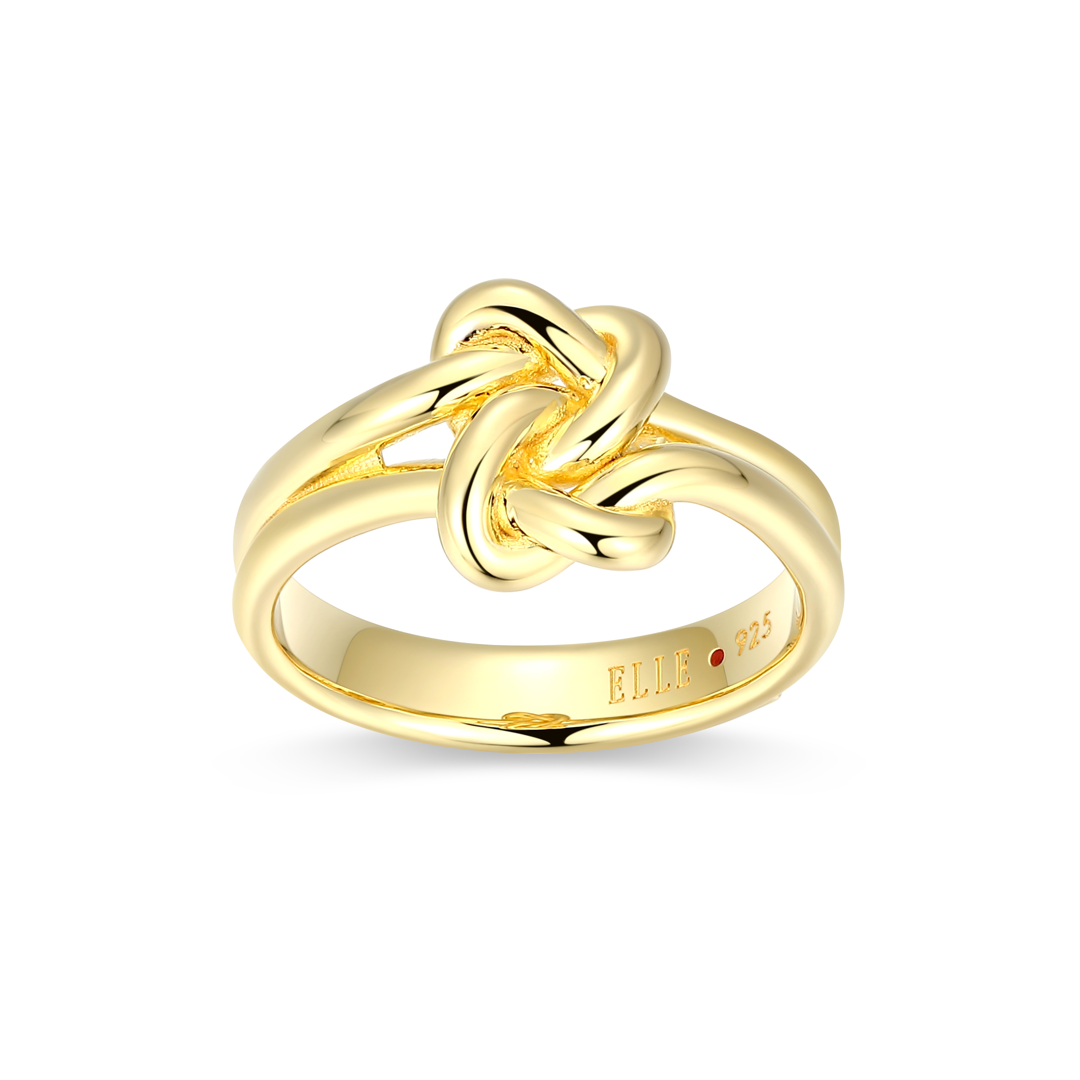 Sterling silver, yellow gold plated ELLE high polished knot ring with trademark red stone in the shank, from the “Eternal Knot” Collection