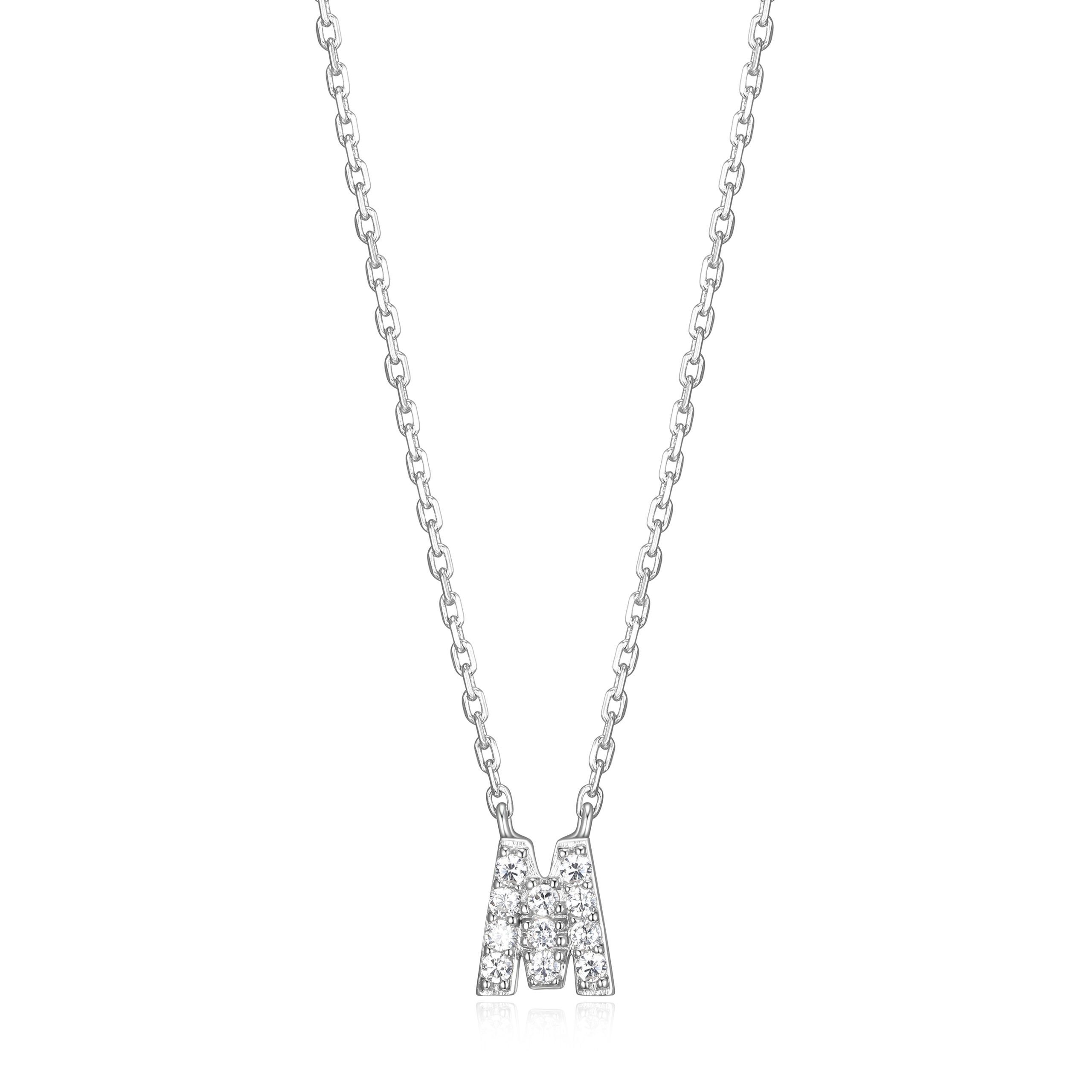 Sterling silver Rhodium plated Cubic Zirconia 5mm mini intial ‘M’ attached to 18″ fine cable link chain with spring ring clasp from the “Mini Initials” Collection