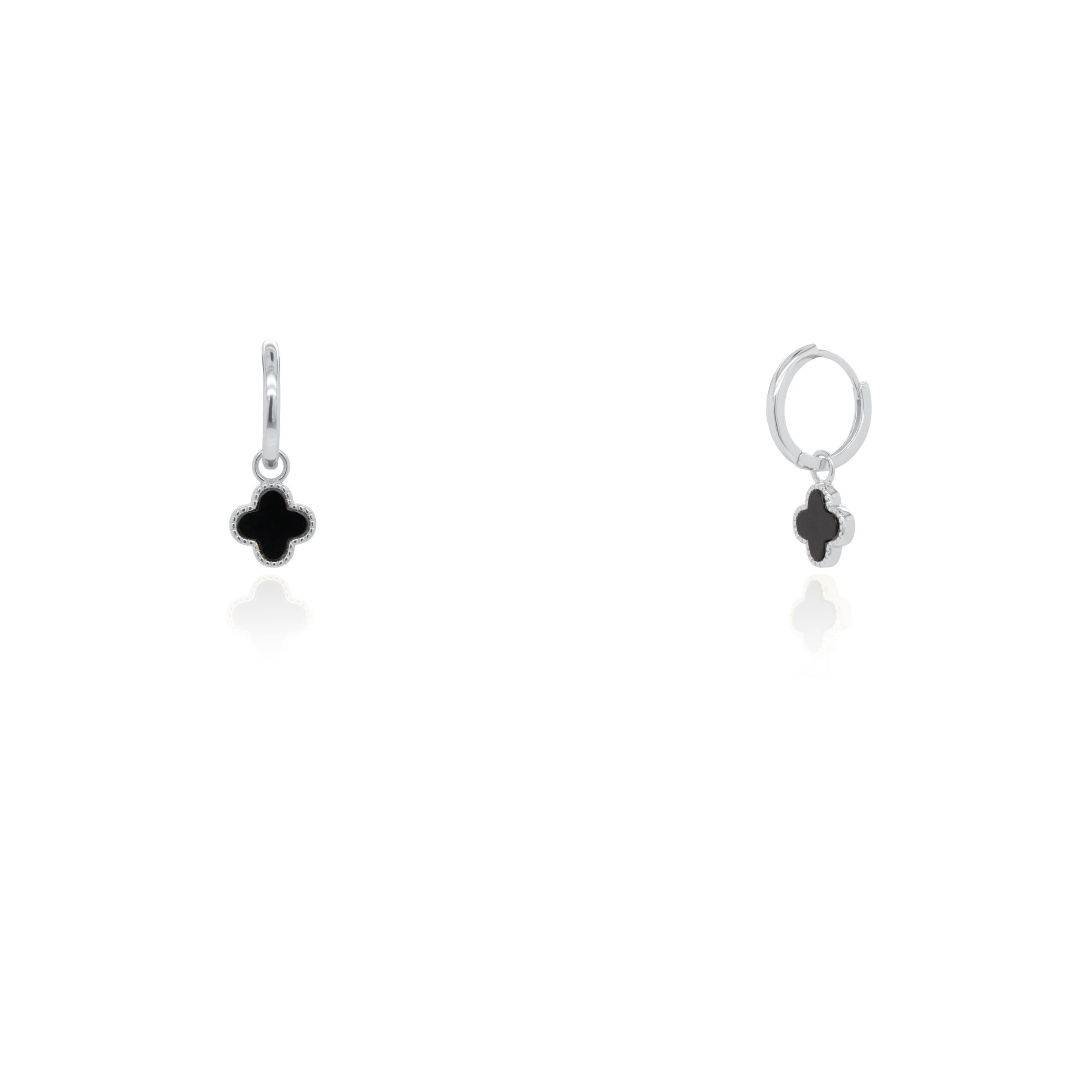 Sterling silver, rhodium plated 15mm huggie hoop earrings with a 10mm black agate clover charm and beaded edge.
