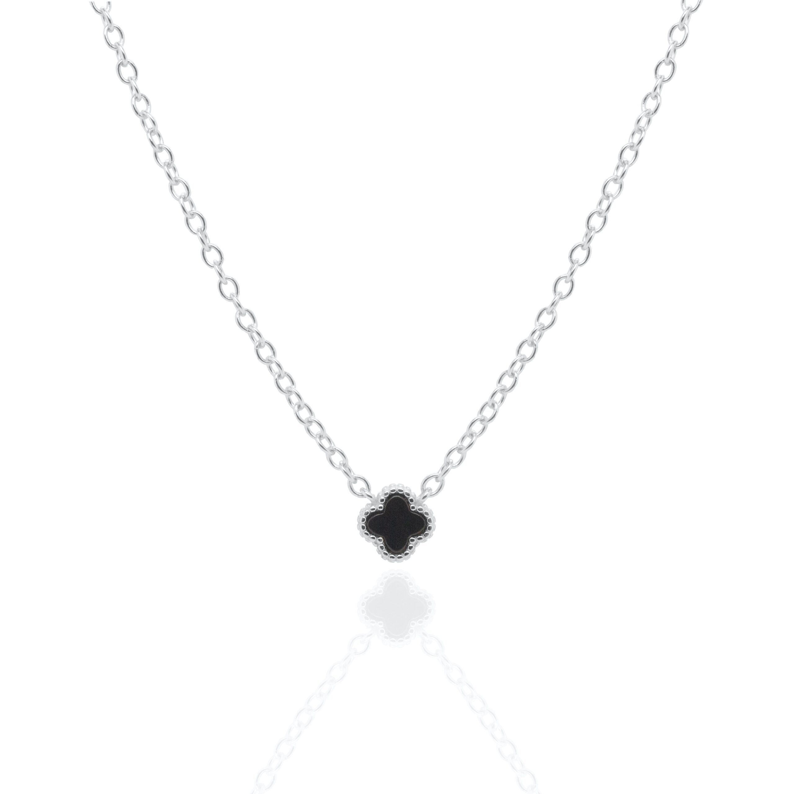 Sterling silver, rhodium plated black agate 6.5mm mini clover necklace with bead accent border.