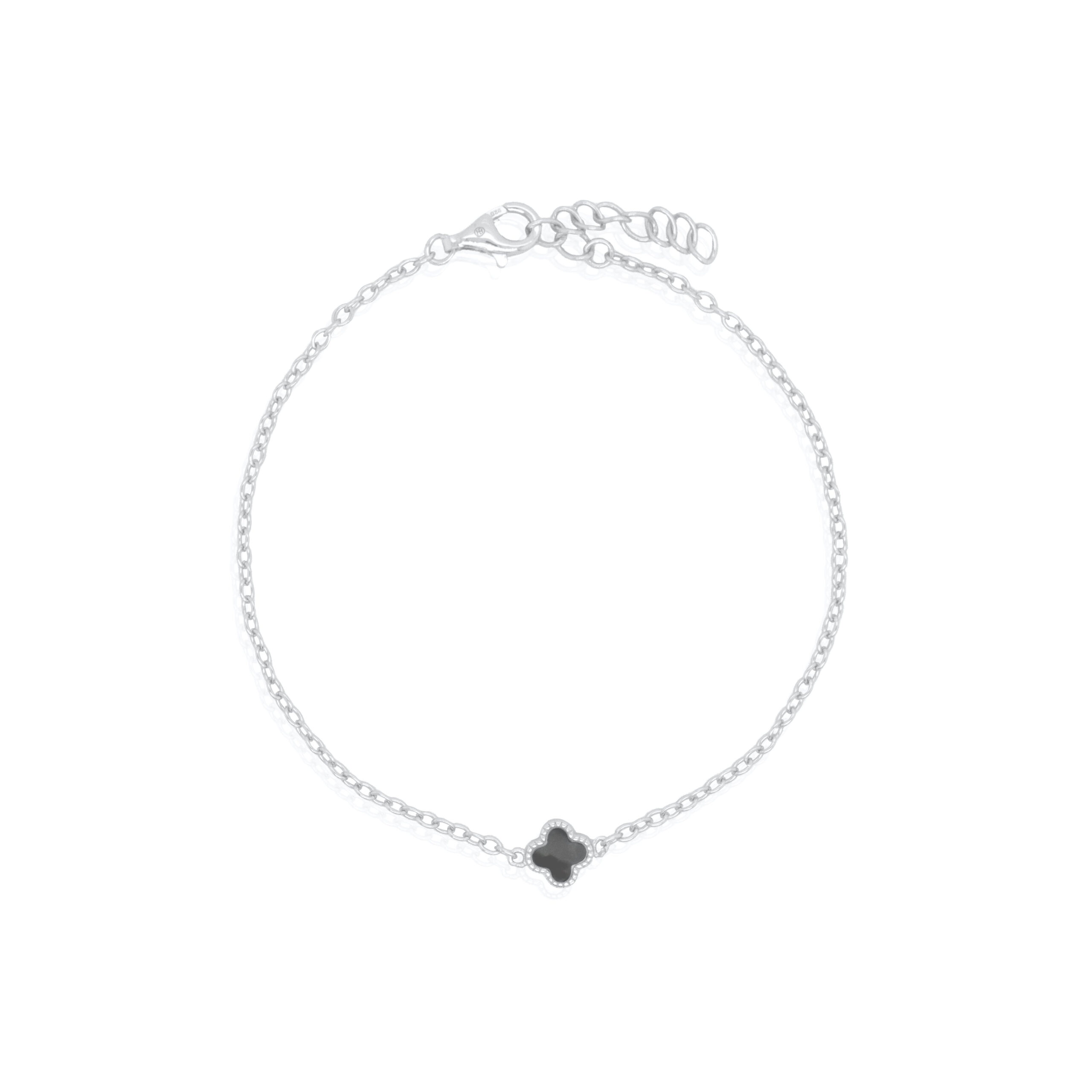 Sterling silver, rhodium plated black agate 6mm mini clover bracelet with beaded edge.