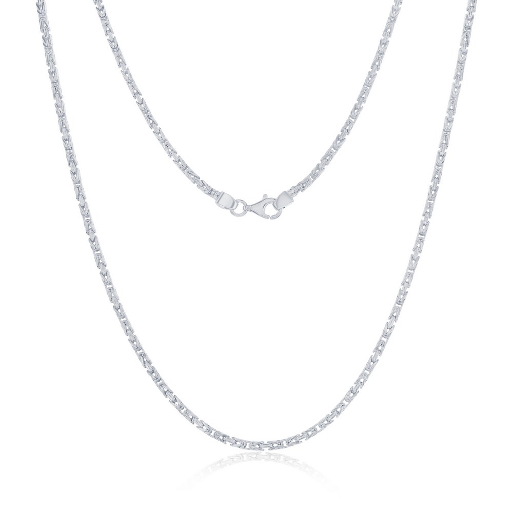 Sterling silver, rhodium plated 18″ 2.7mm Byzantine chain with a lobster clasp.