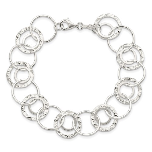 Sterling silver 7.5″ fancy circle link bracelet with 16 x 2mm textured links and a trigger clasp.