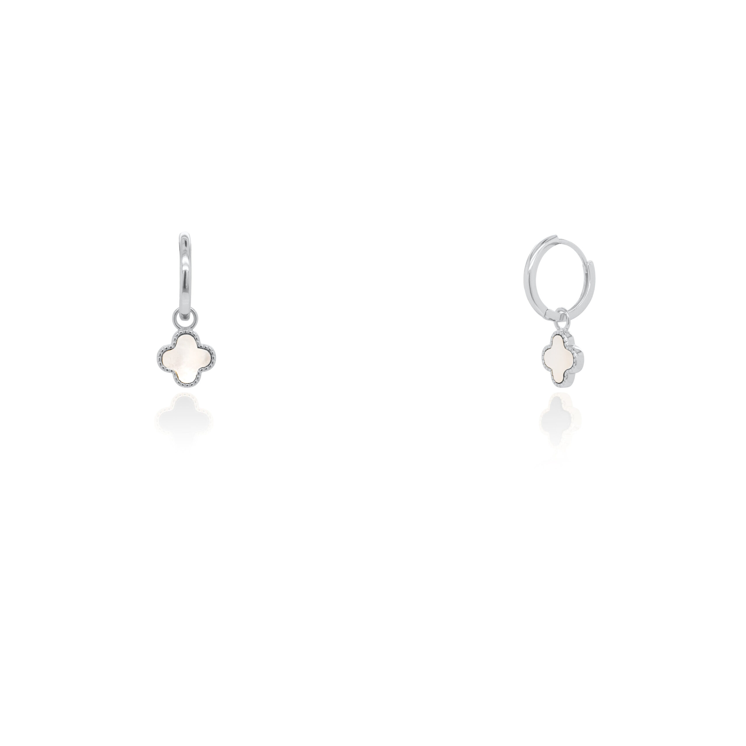 Sterling silver, rhodium plated 15mm huggie hoop earrings with a 10mm mother of pearl clover charm with beaded edge.