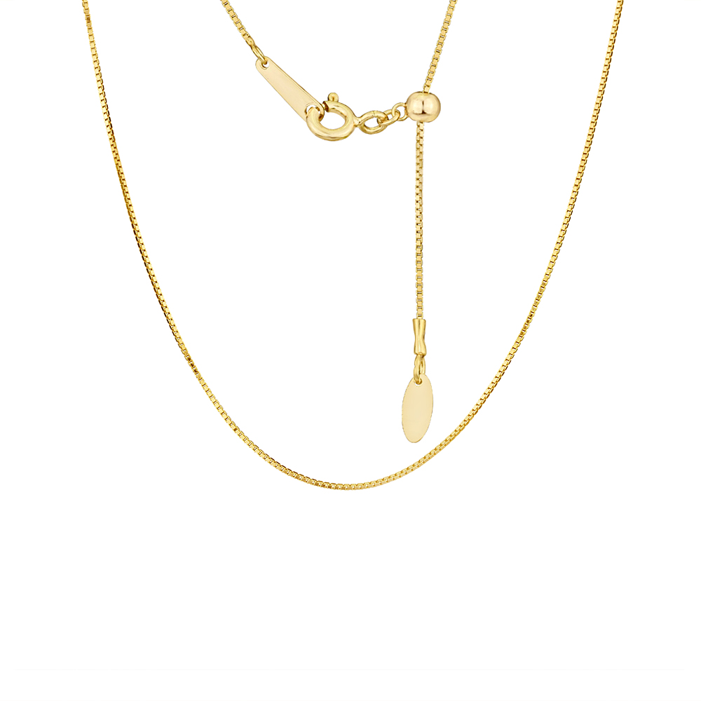 Sterling silver, yellow gold plated adjustable 14-22″ 0.65mm box link chain with spring ring clasp.